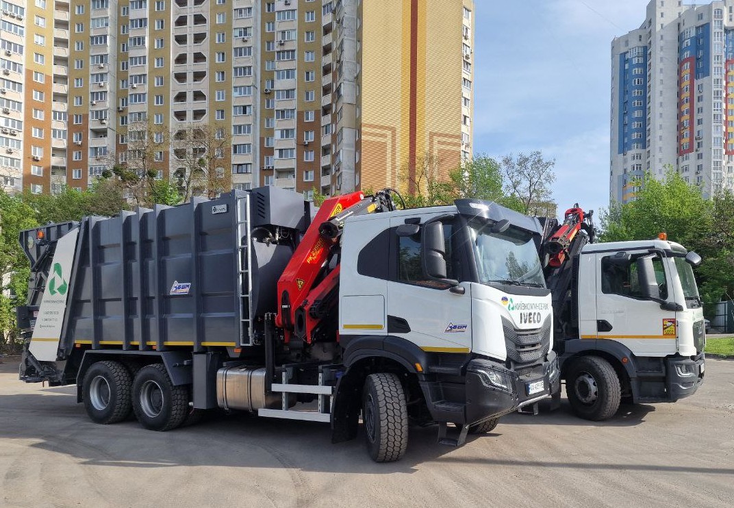 – на шасі вантажного автомобіля IVECO, з бункером накопичувачем та краном маніпулятором ВЛІВ супер медіум КМУ,