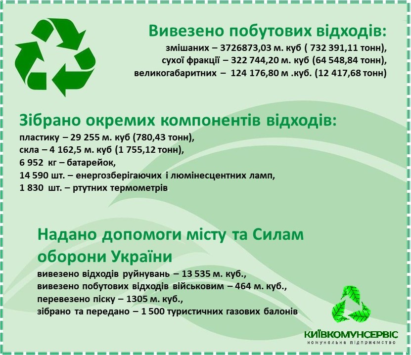- роздільно зібраних відходів – пластику 29 255 м. куб (780,43 тонн), м. куб., скла м. 4 162,5 м. куб (1 755,12 тонн);